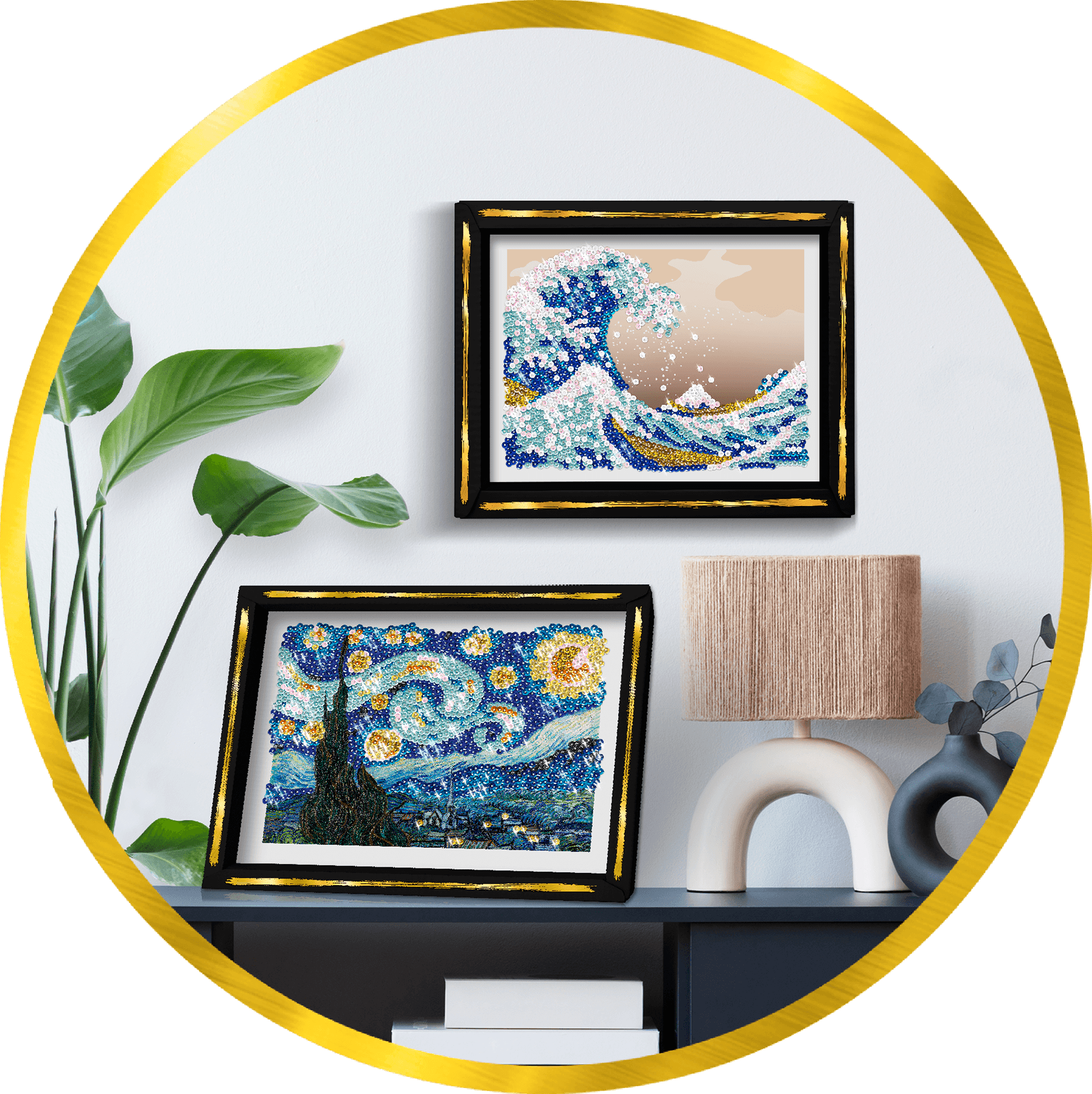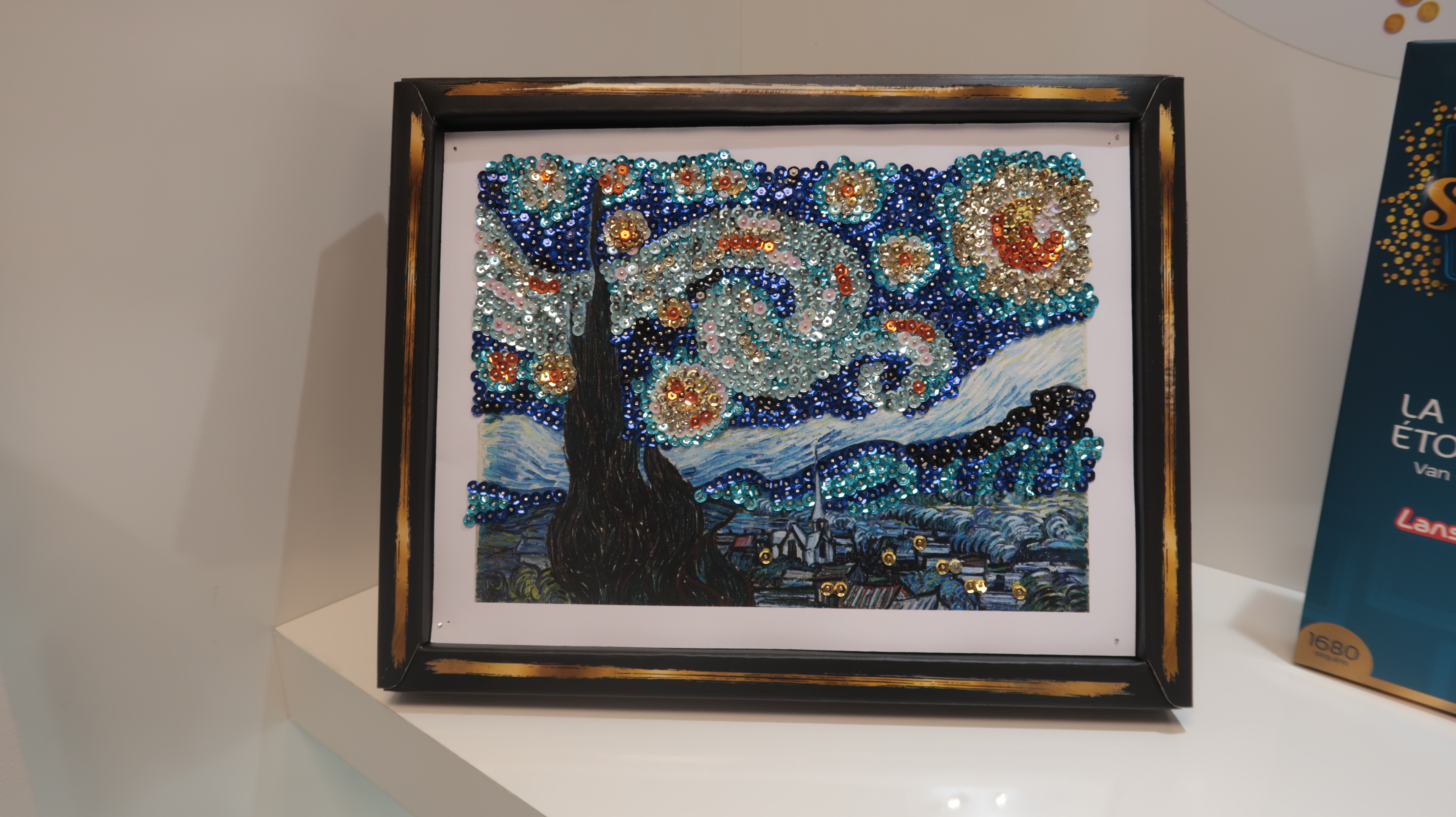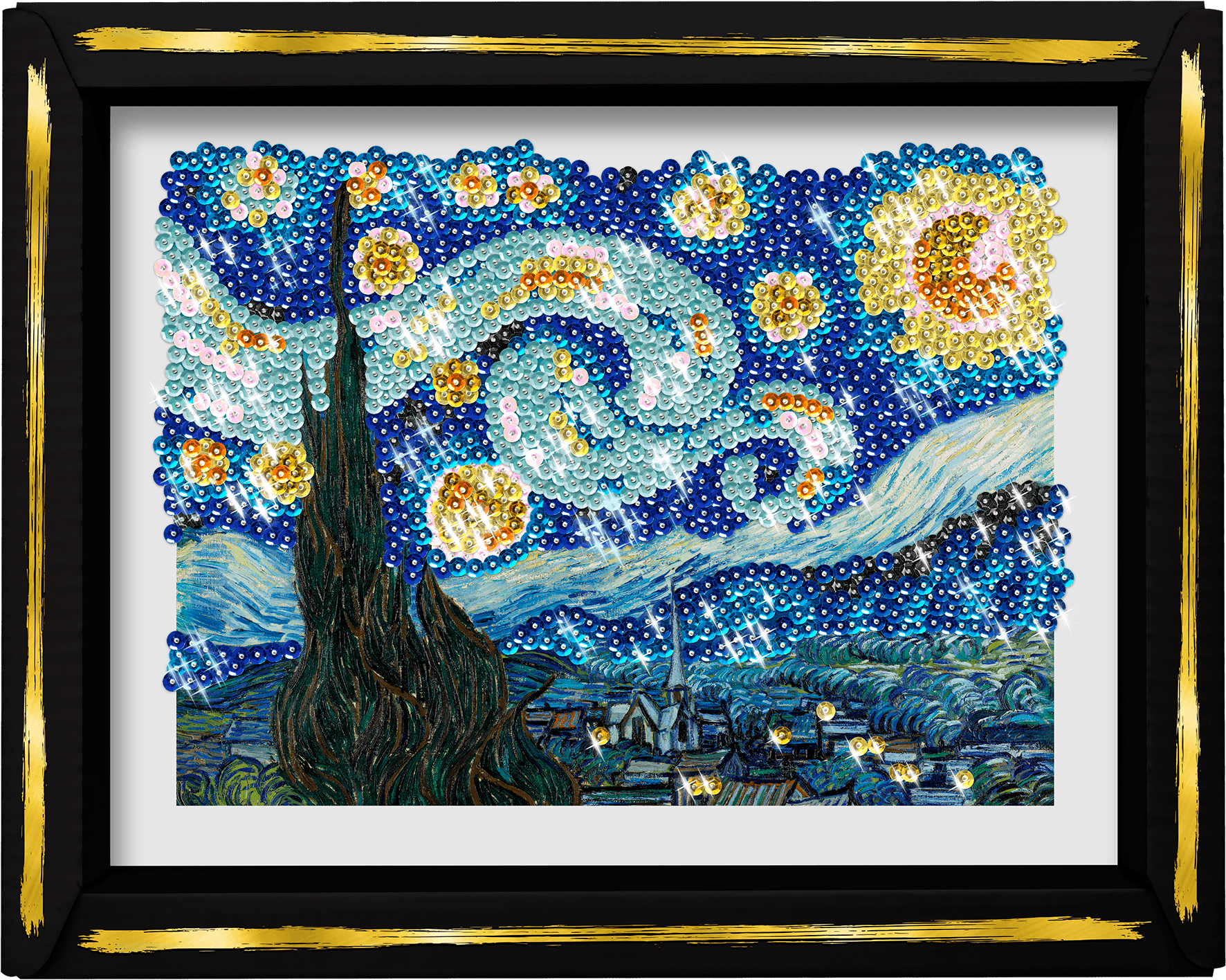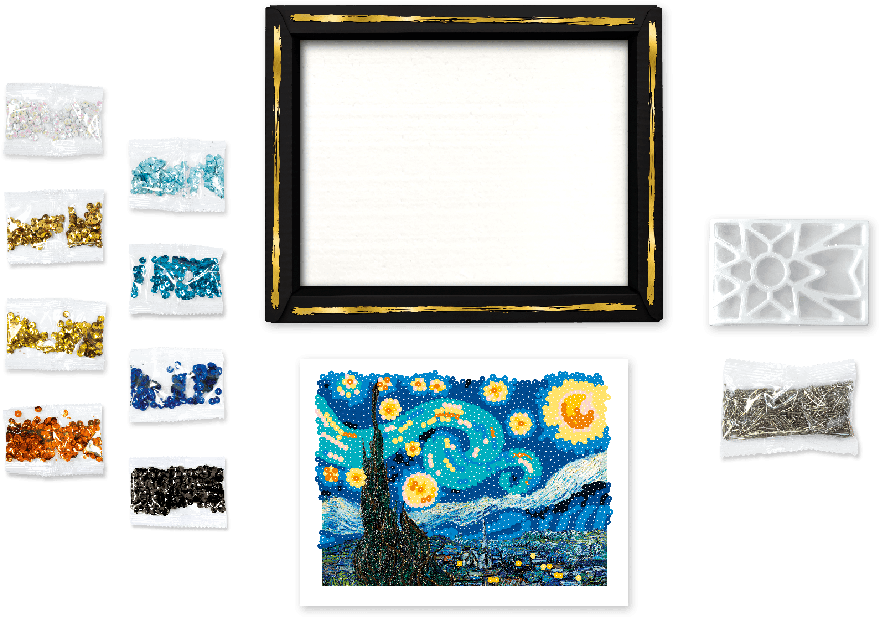 Dans ce coffret, vous trouverez l’illustration d’un tableau de Vang Gogh dans son cadre, avec une plaque de polystyrène qui sert de base pour fixer les sequins à l’aide de petites épingles.