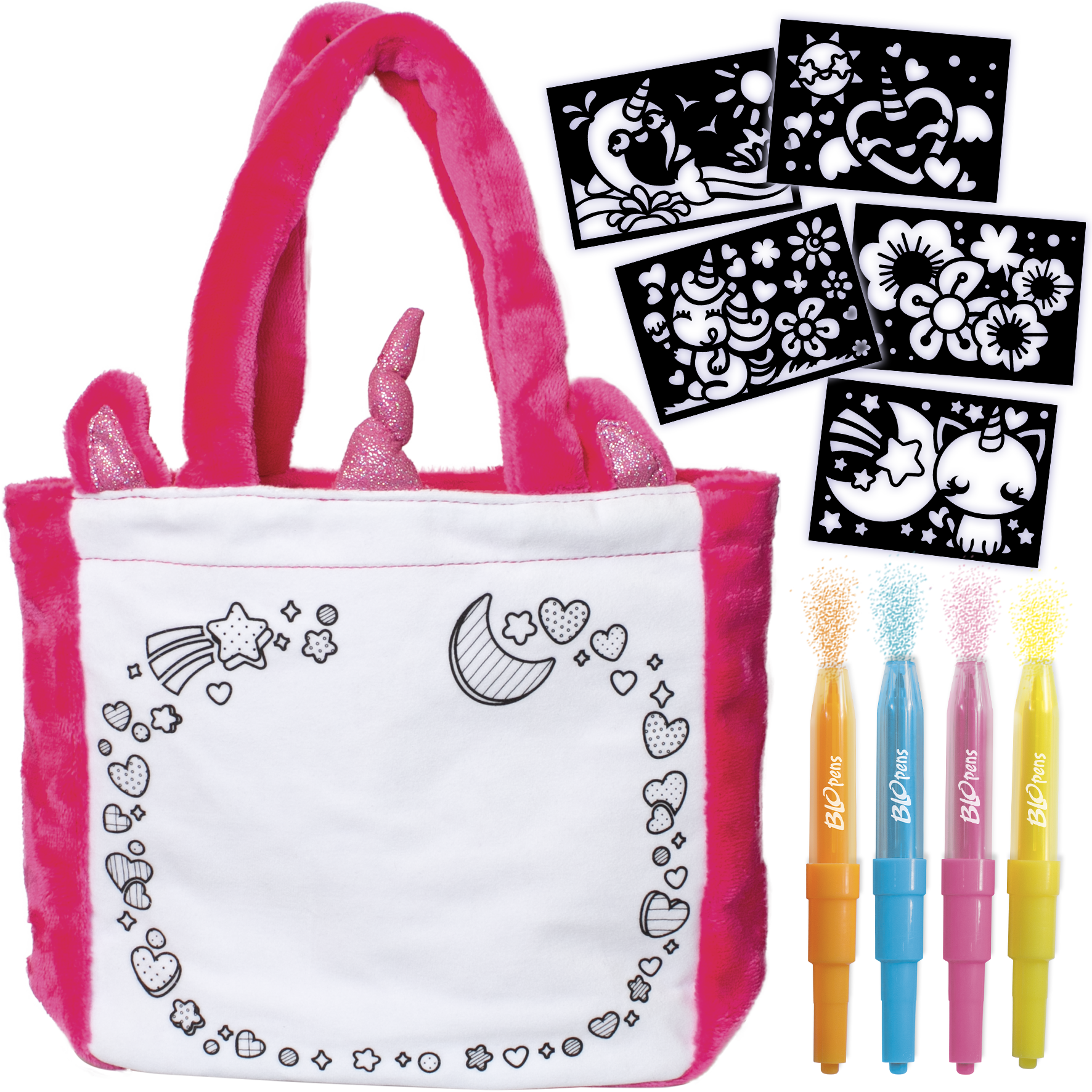 Munis-toi de tes feutres Blopens, colorie le décor, et choisis le pochoir que tu veux pour le décor principal. Place ton pochoir sur le sac, souffle dans tes Blopens et regarde ton dessin prendre vie avec un effet aérographe magique.