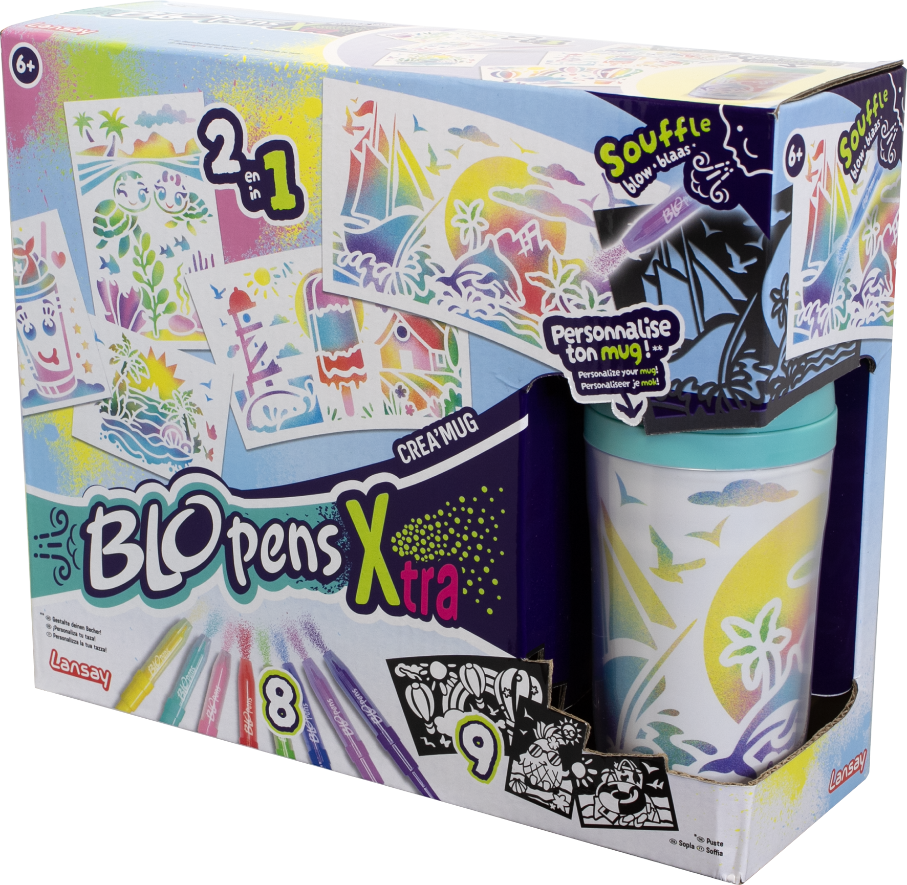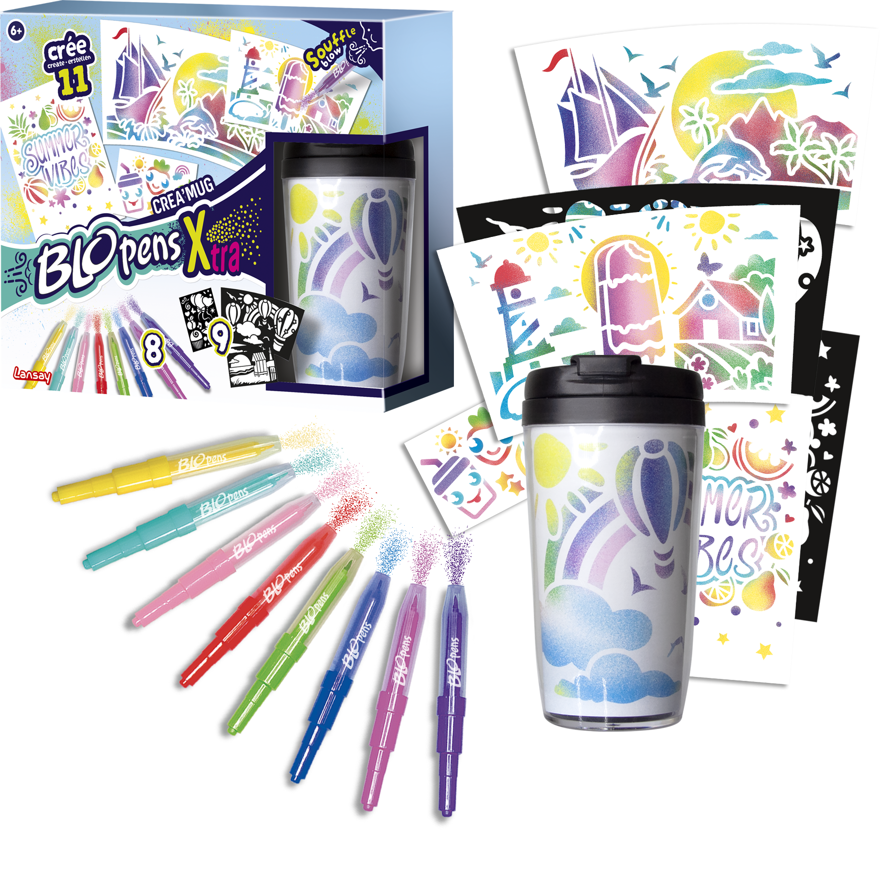 Profite des vacances avec ce set Blopens : utilise un pochoir, place-le sur une feuille et souffle dans tes Blopens pour voir tes dessins à effet aérographe apparaître comme par magie.