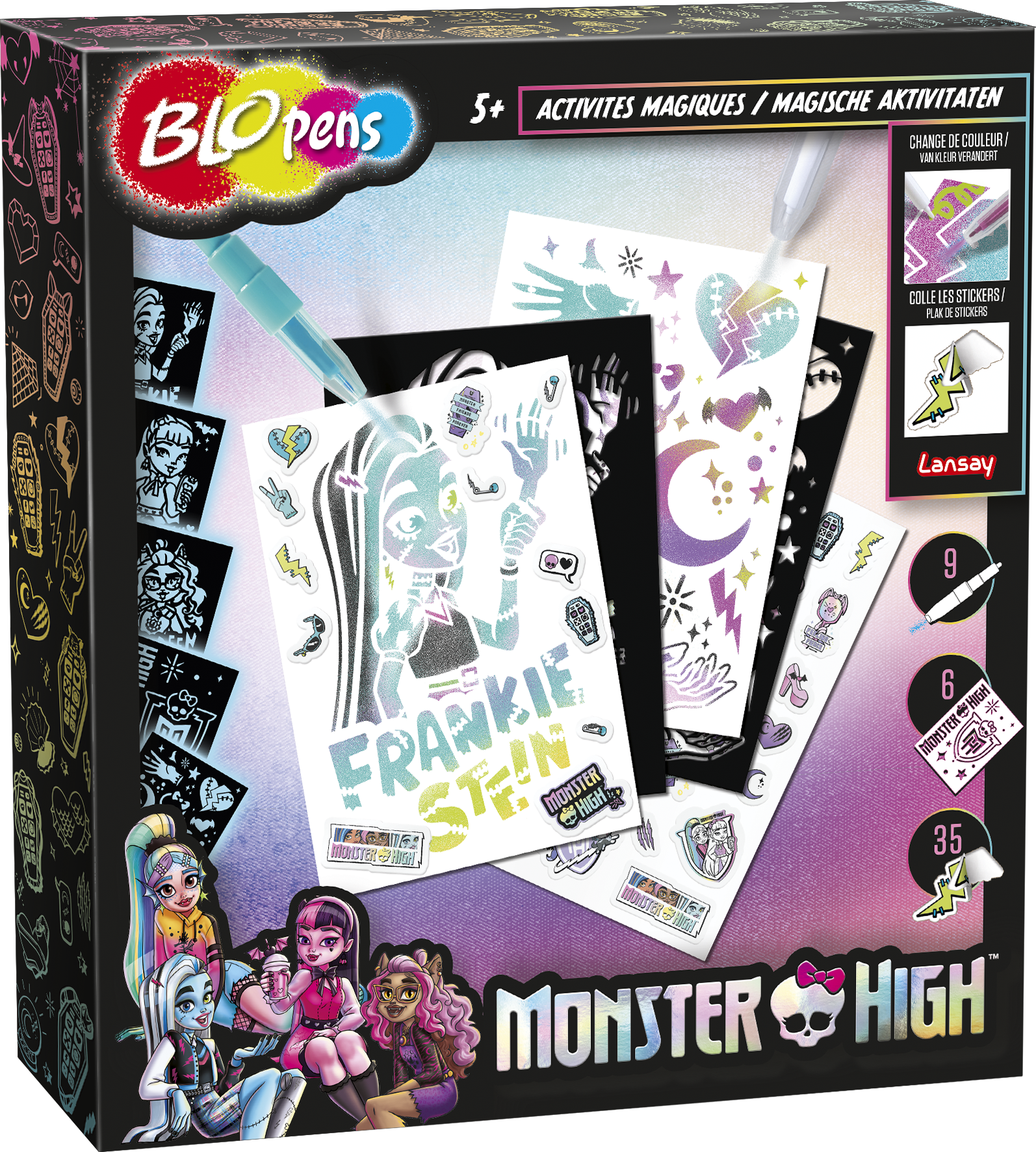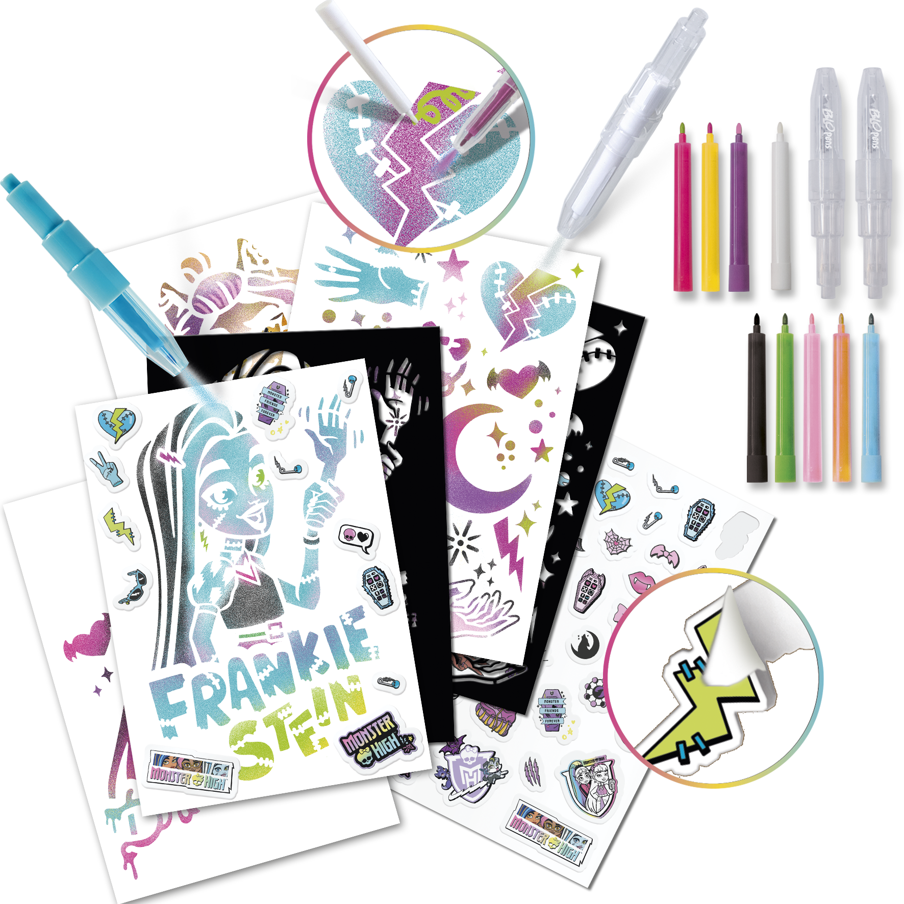 Amuse-toi à coloriser Draculaura, Frankie Stein et Clawdeen Wolf grâce à des pochoirs super cool et ajoute des effets grâce aux