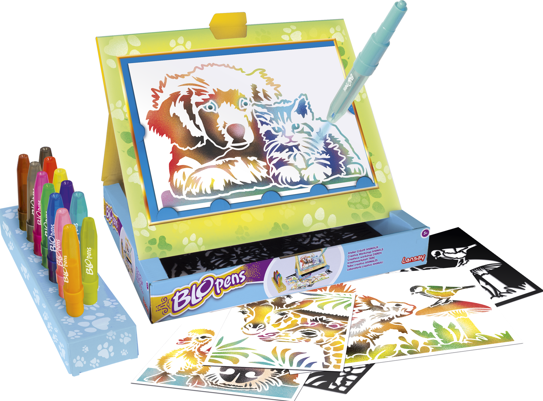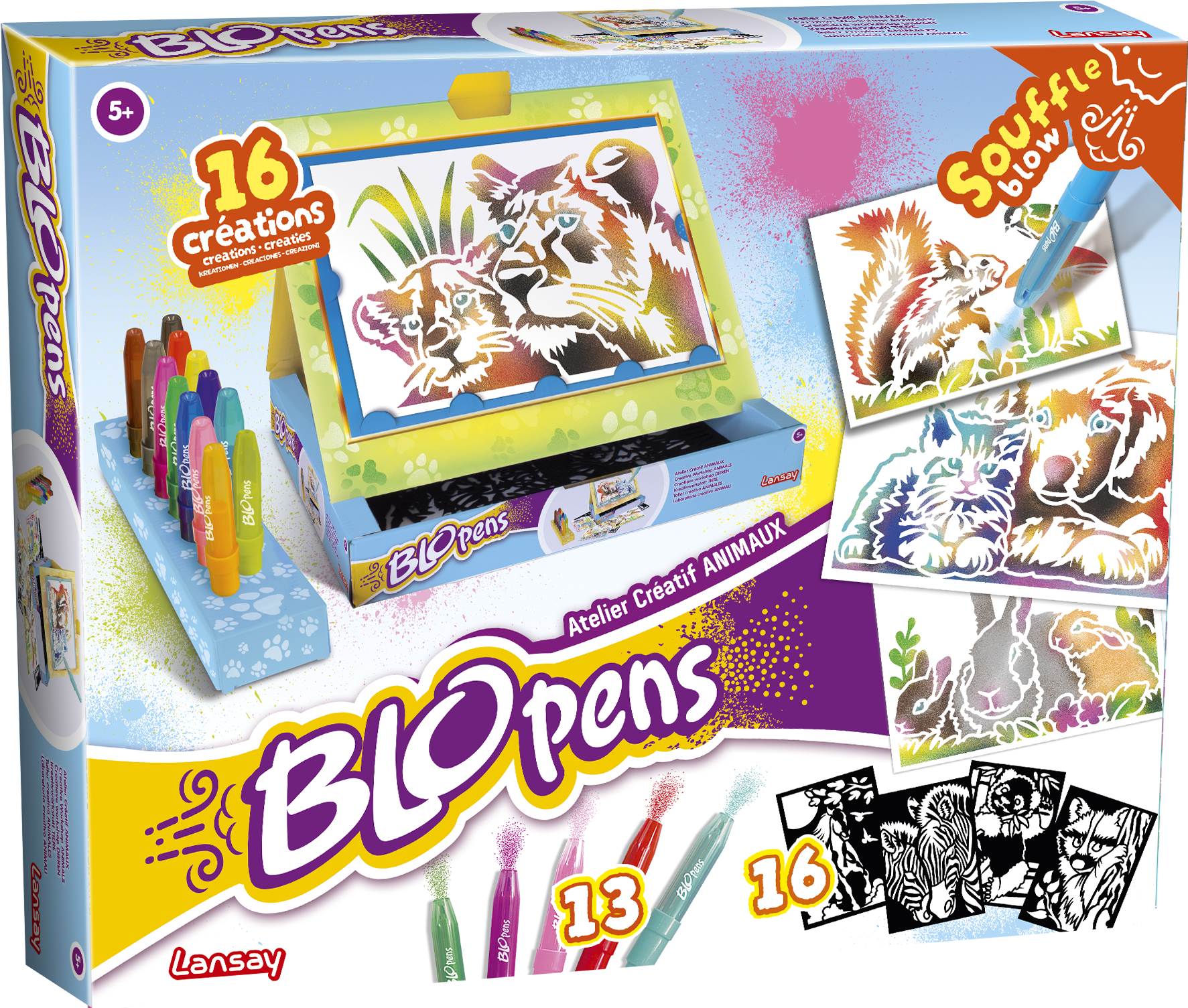 Place ta feuille de dessin et ton pochoir sur le pupitre, souffle dans tes Blopens et regarde ton dessin apparaître avec un effet aérographe !