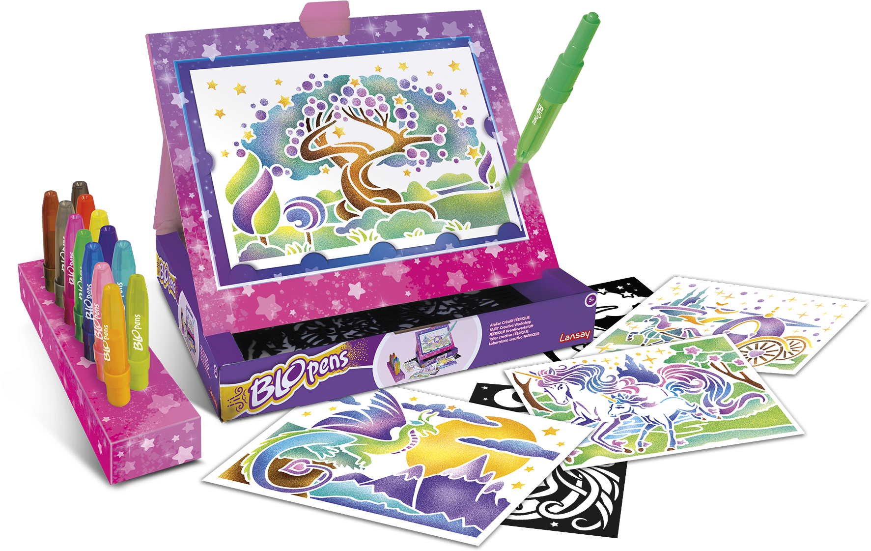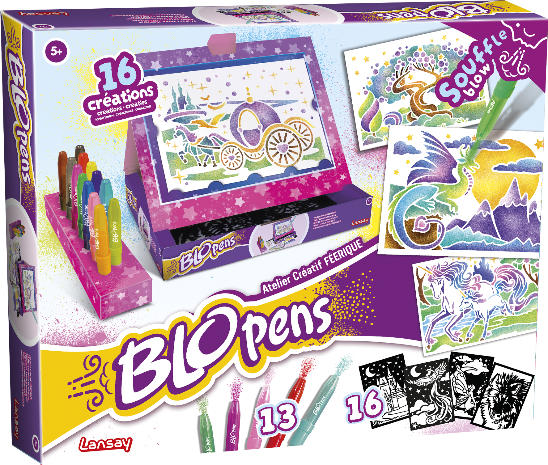 Place ta feuille de dessin et ton pochoir sur le pupitre, souffle dans tes Blopens et regarde ton dessin apparaître avec un effet aérographe !