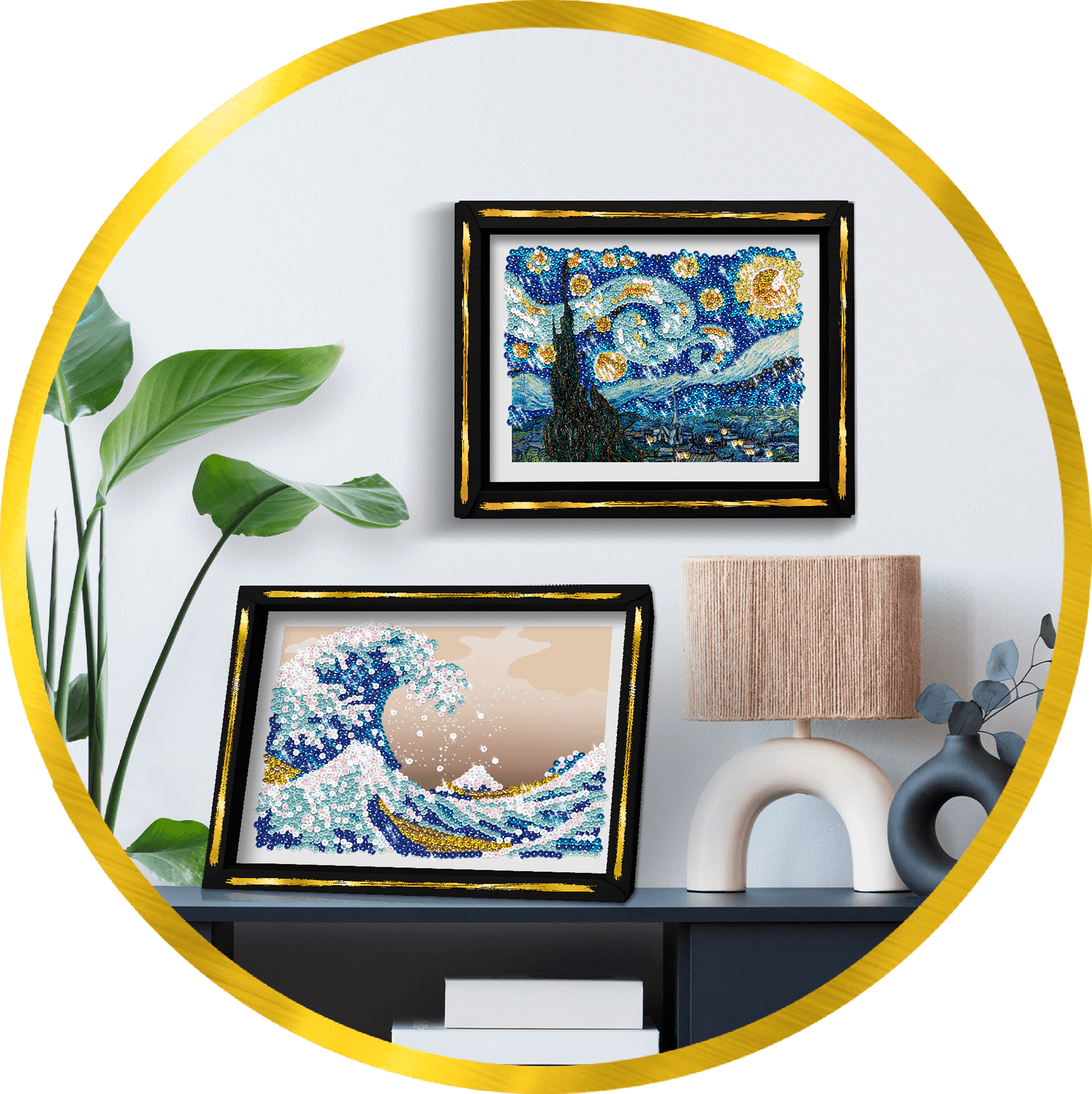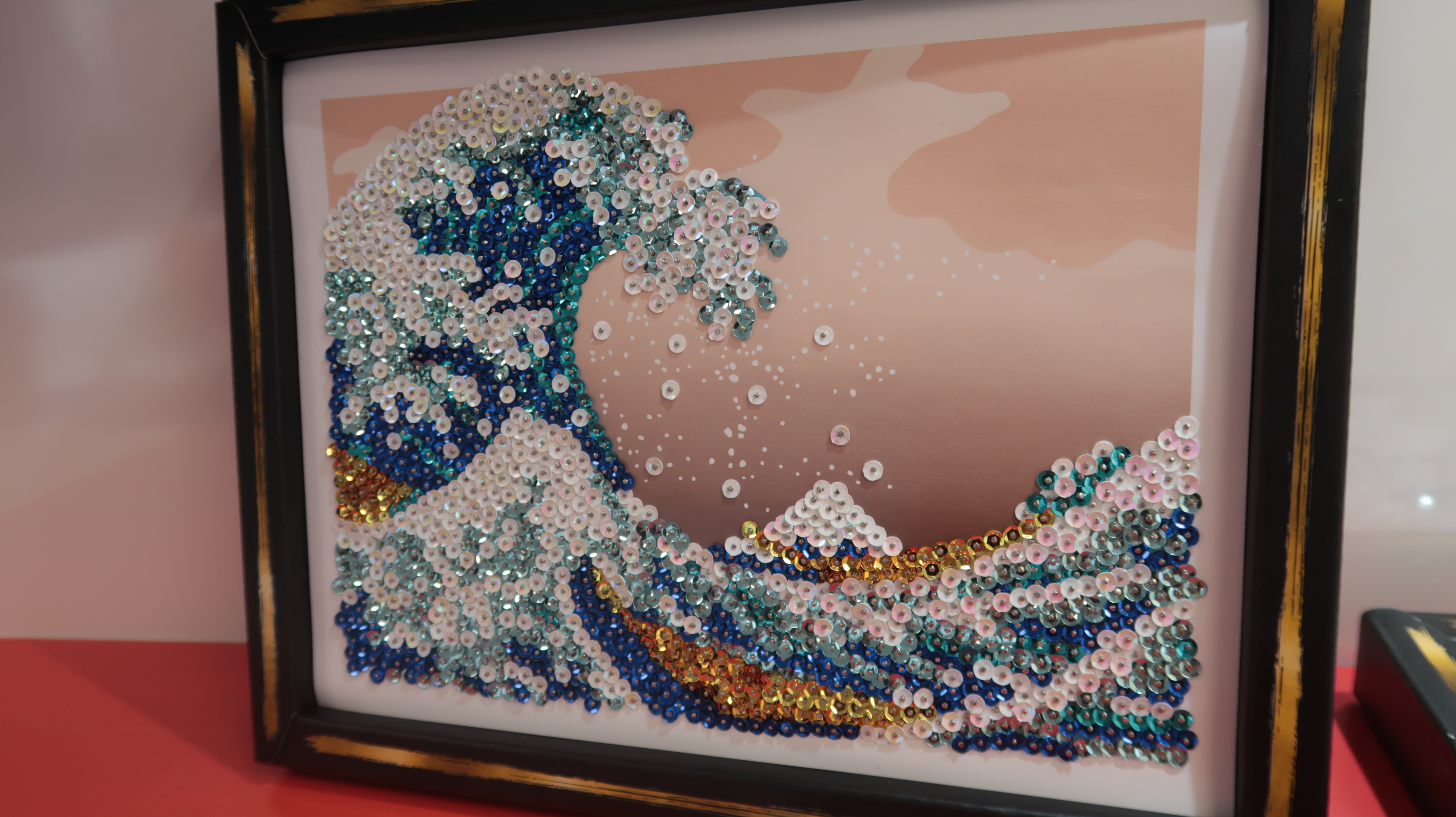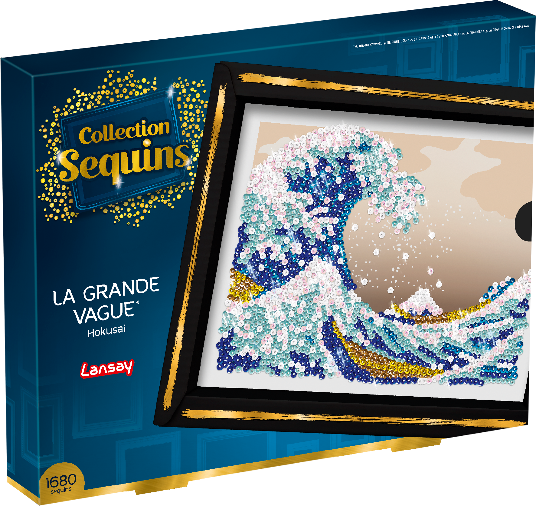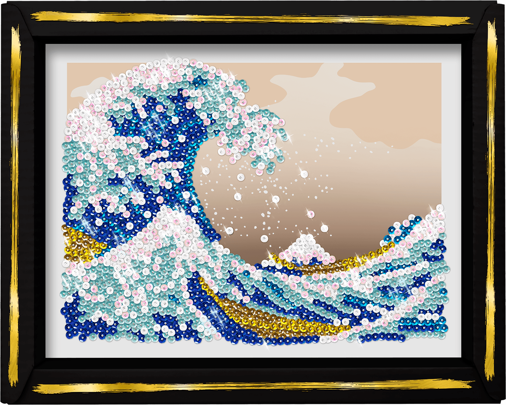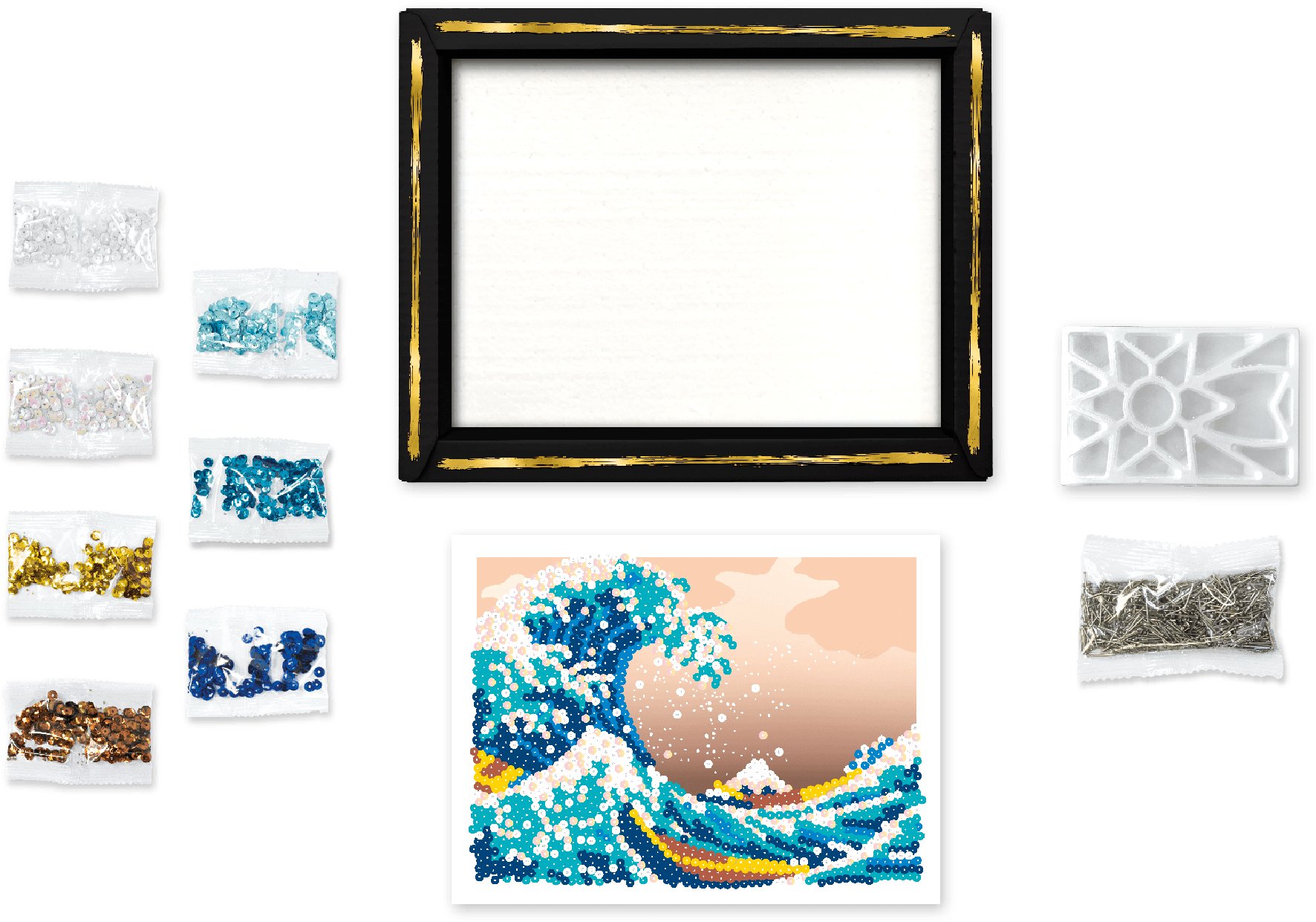 Dans ce coffret, vous trouverez l’illustration d’un tableau d’Hokusai dans son cadre, avec une plaque de polystyrène qui sert de base pour fixer les sequins à l’aide de petites épingles.