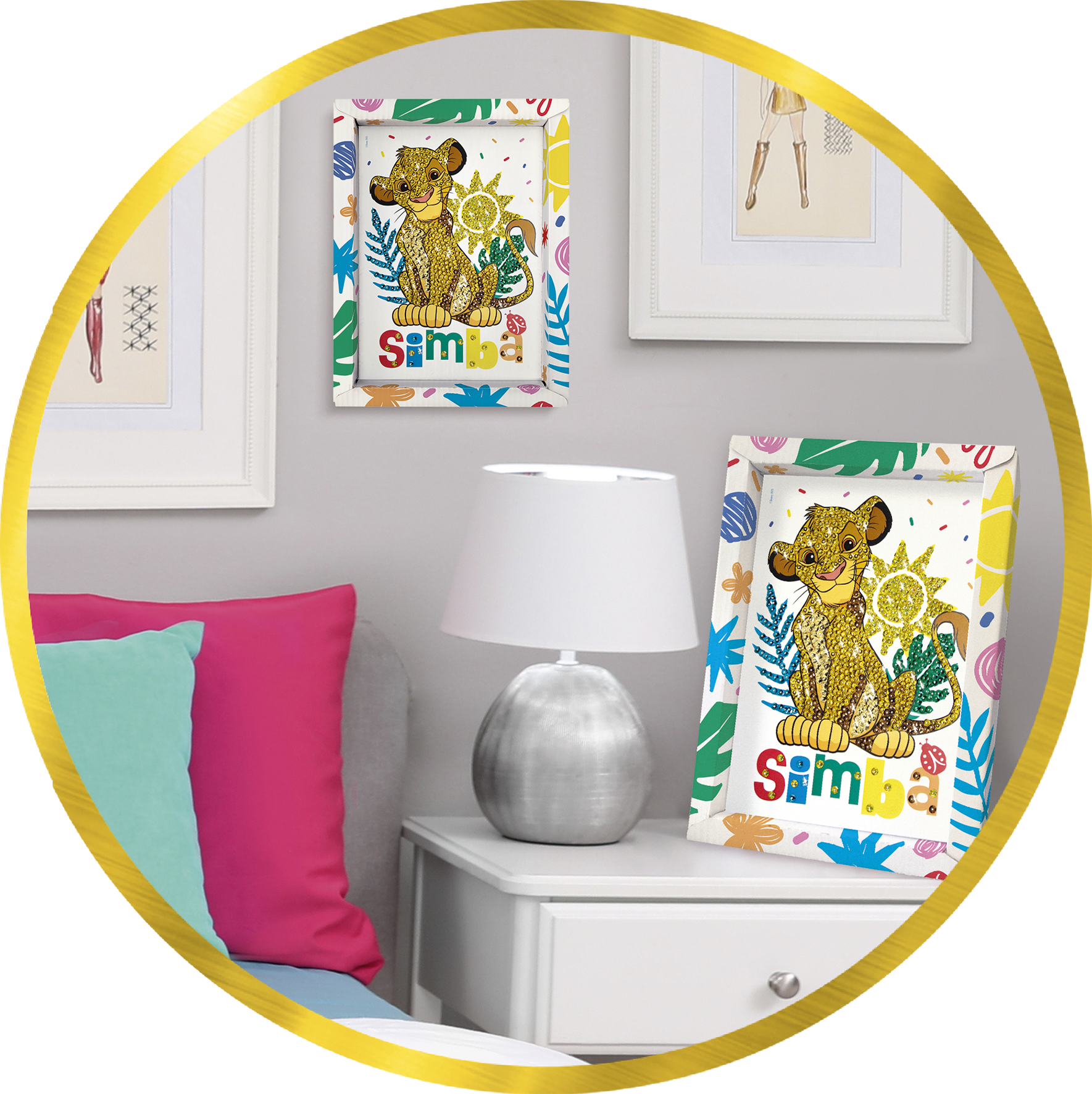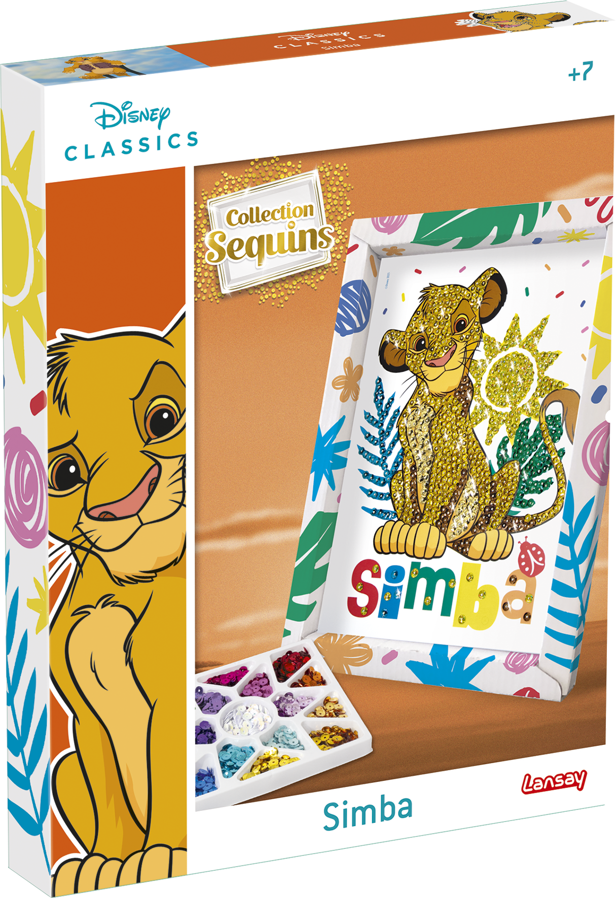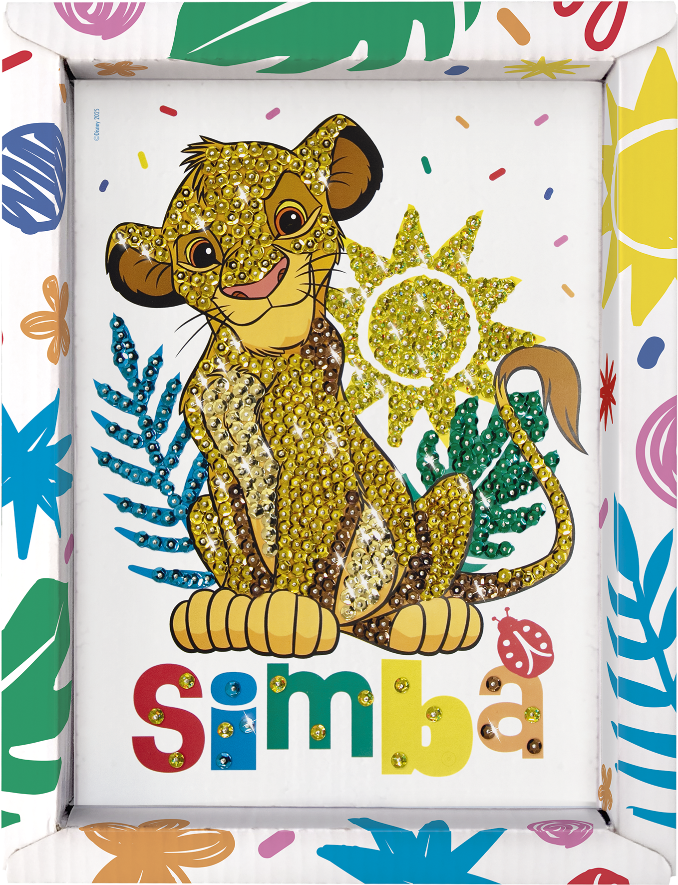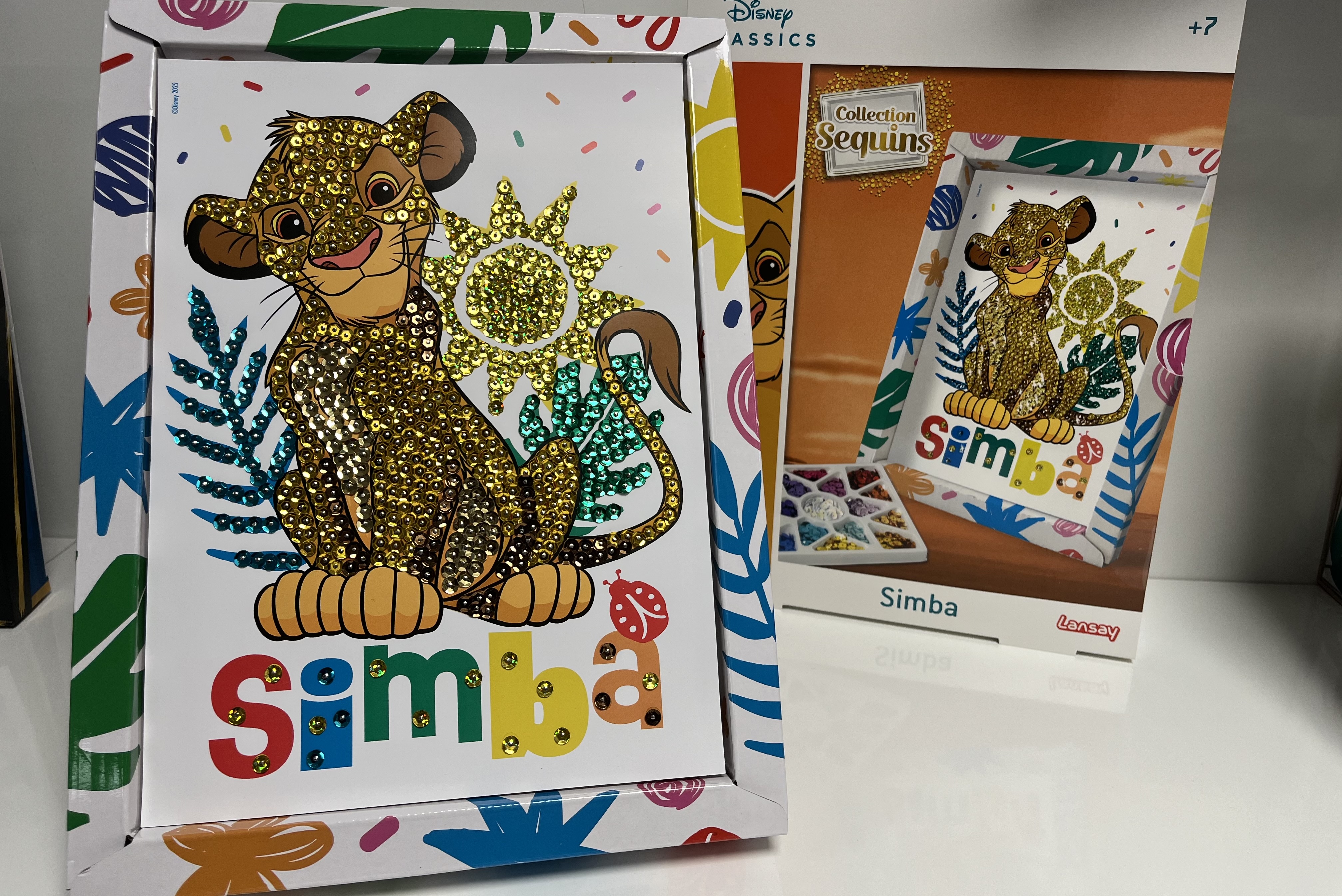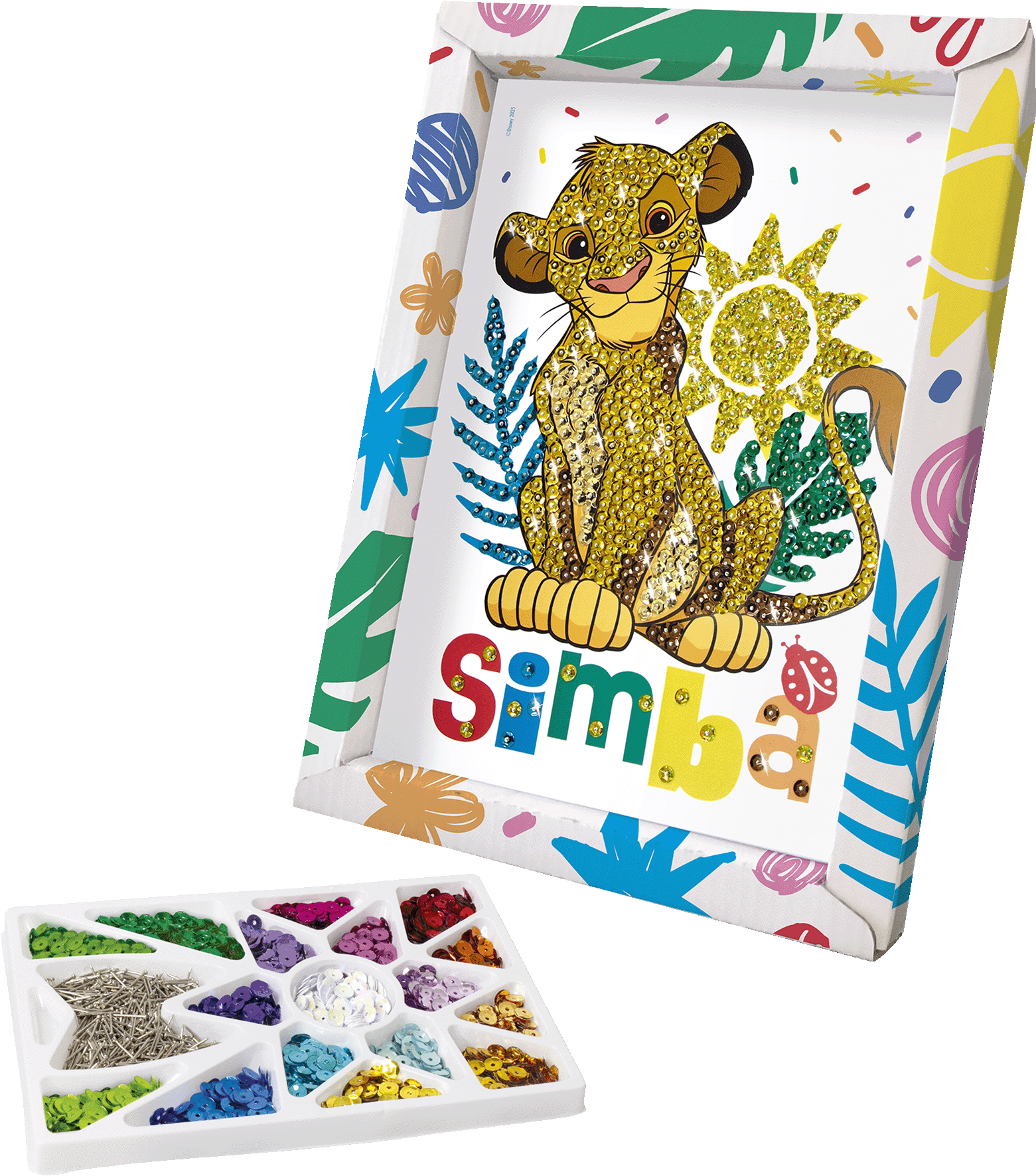 Dans ce kit, tu trouveras l'illustration de Simba du Roi Lion dans son cadre, avec une plaque de polystyrène qui sert de base pour fixer les sequins à l'aide de petites épingles.