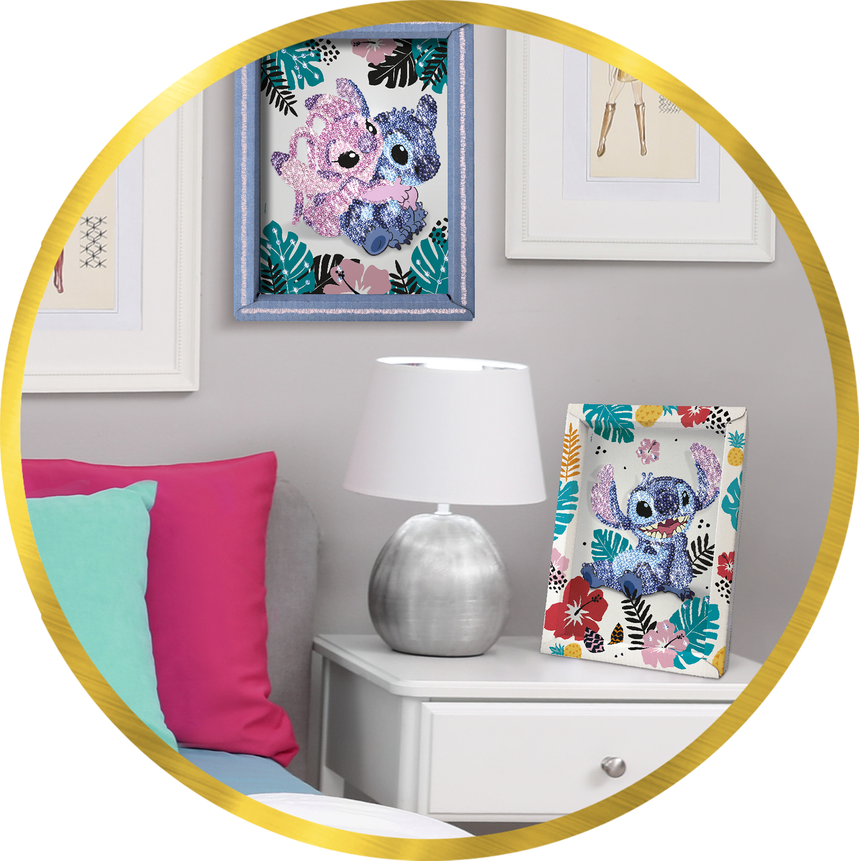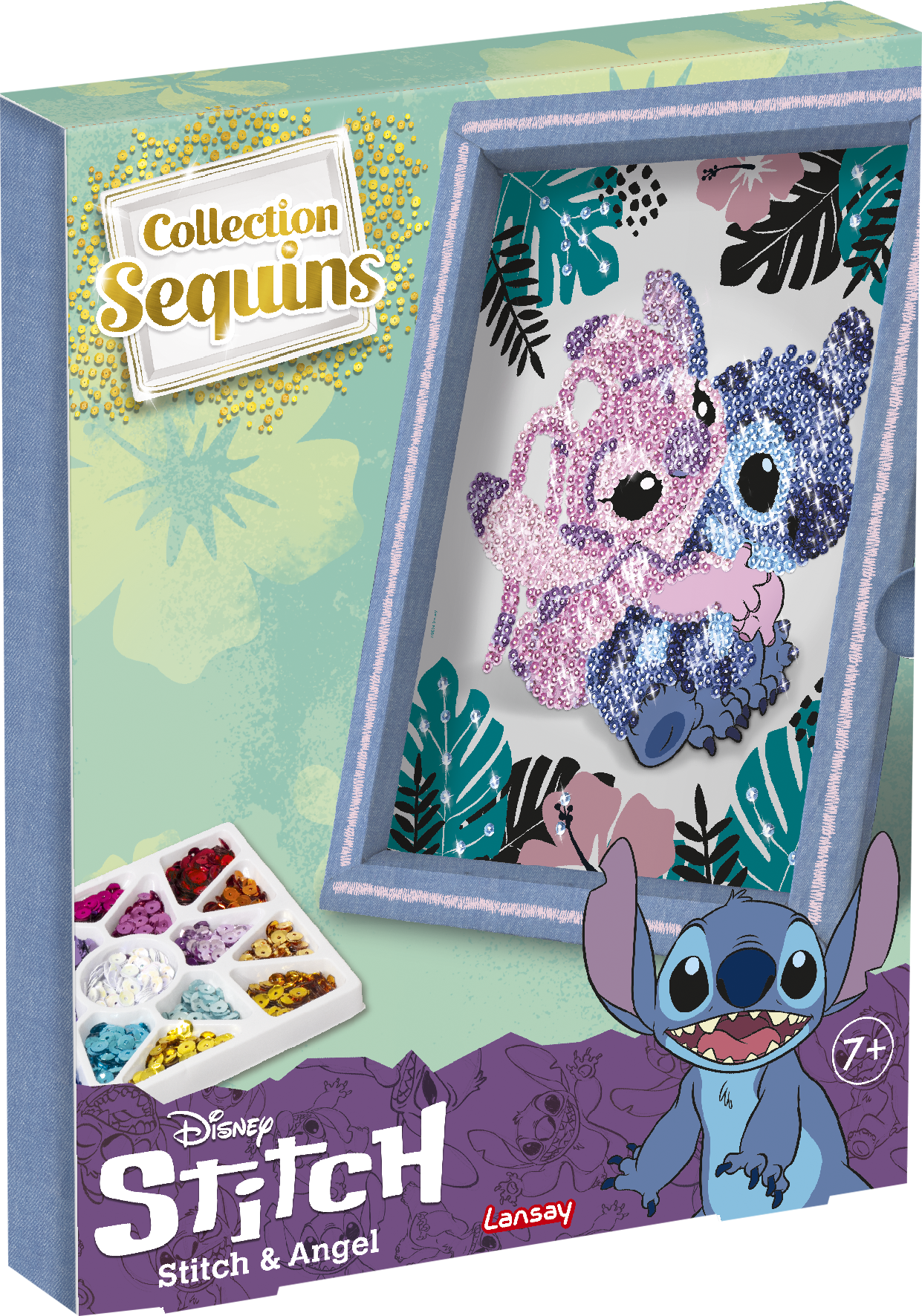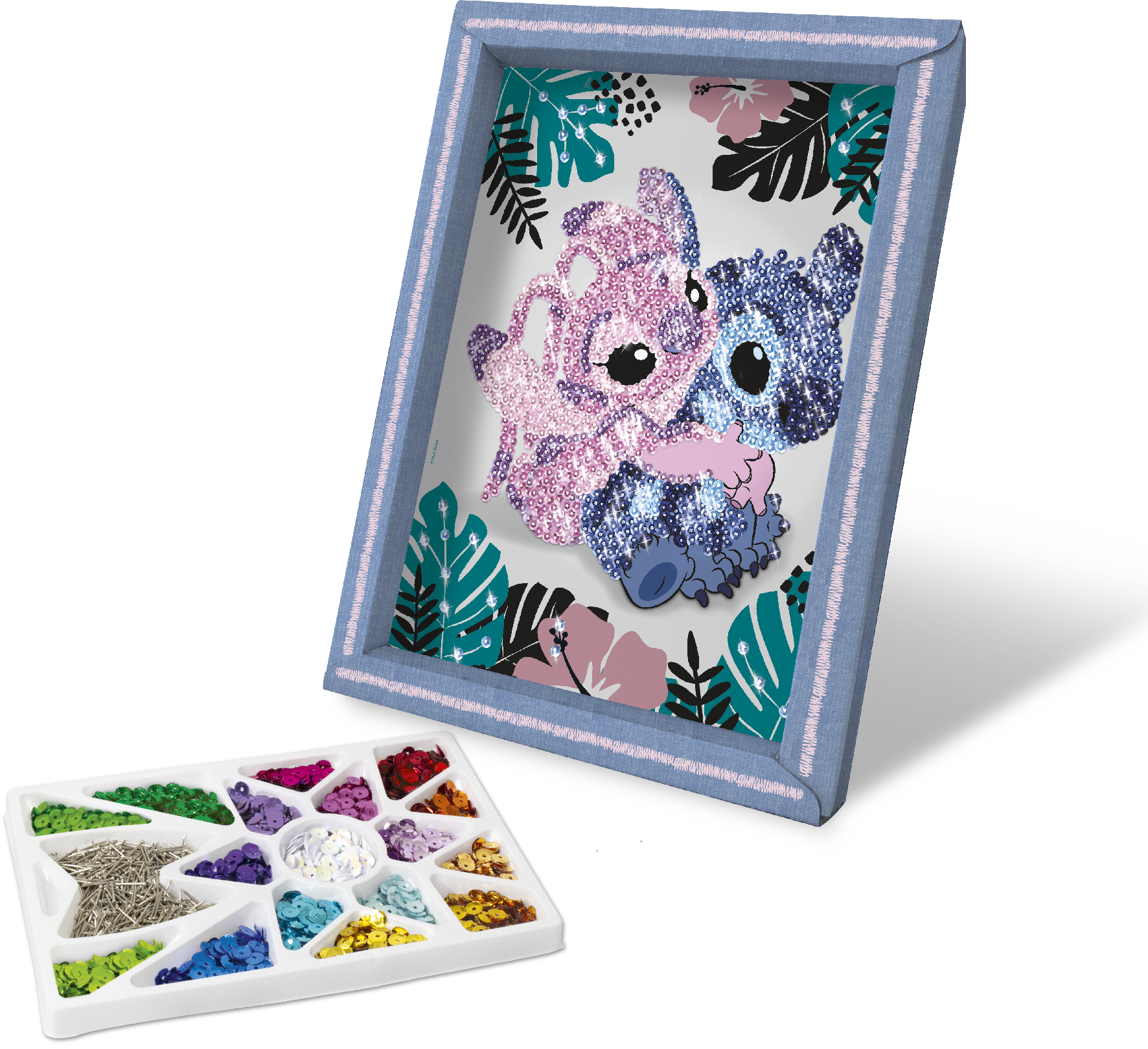 Dans ce kit, tu trouveras l’illustration de Stitch & Angel dans son cadre, avec une plaque de polystyrène qui sert de base pour fixer les sequins à l’aide de petites épingles.