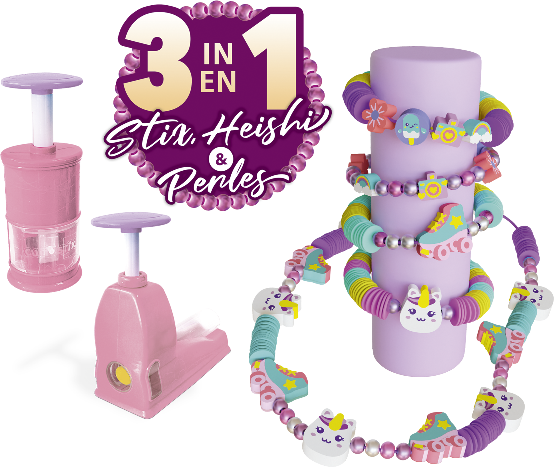 Contient : 1 atelier de découpe, 1 atelier de perçage, 11 Stix, 1 baguette, 2 moules de découpe, 6 fermoirs, 1 tige poussoir, 2 boîtes en plastique, 2 bobines de fil élastique, 1 adaptateur Heishi et 1 notice.