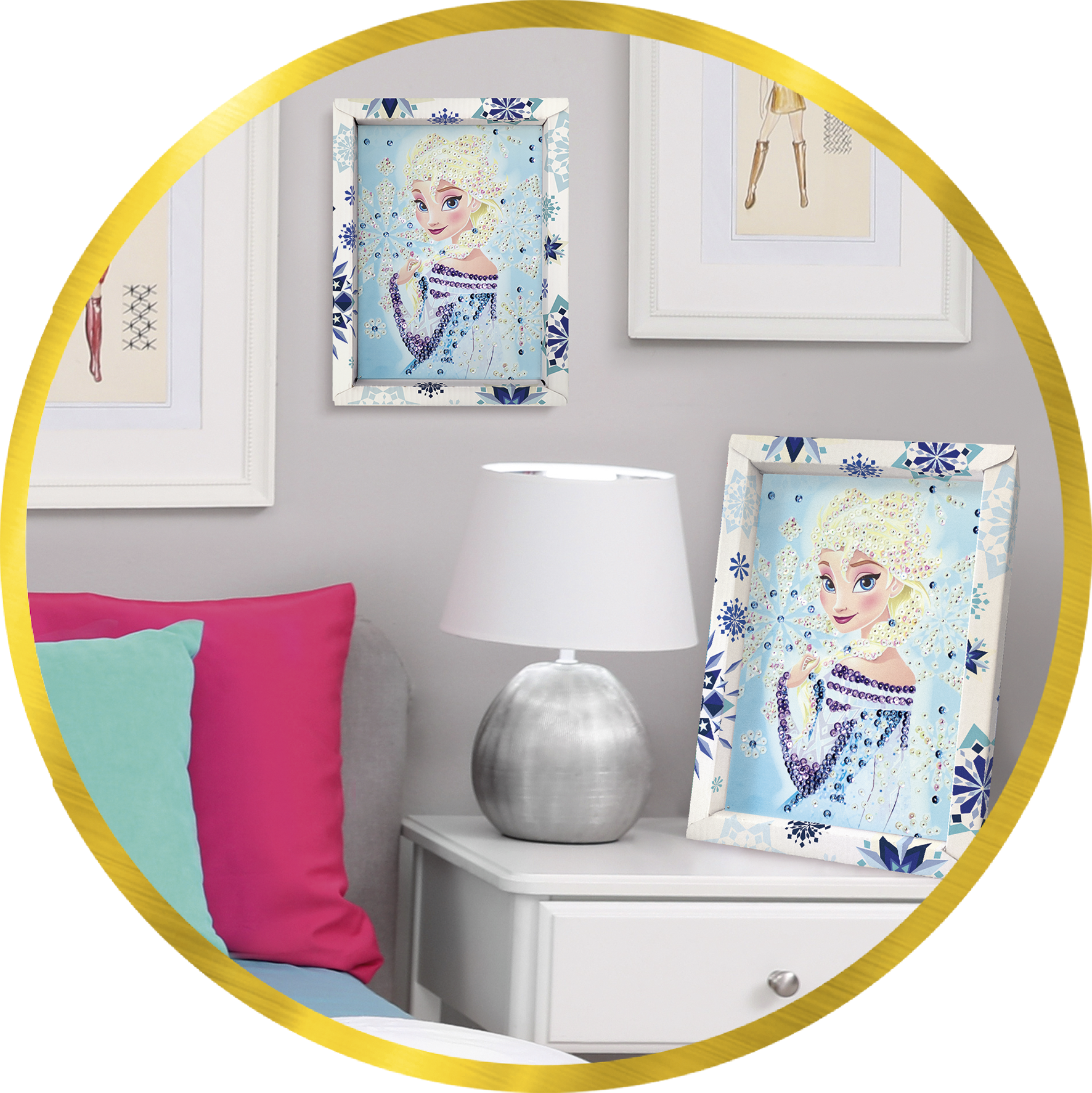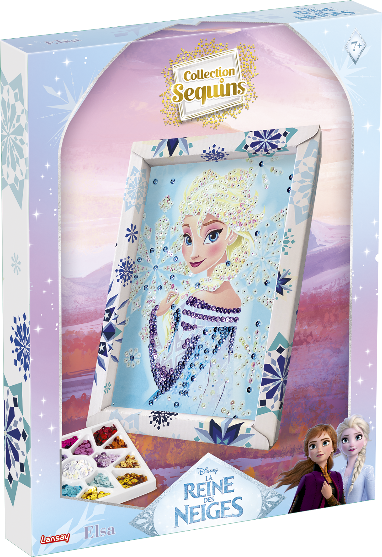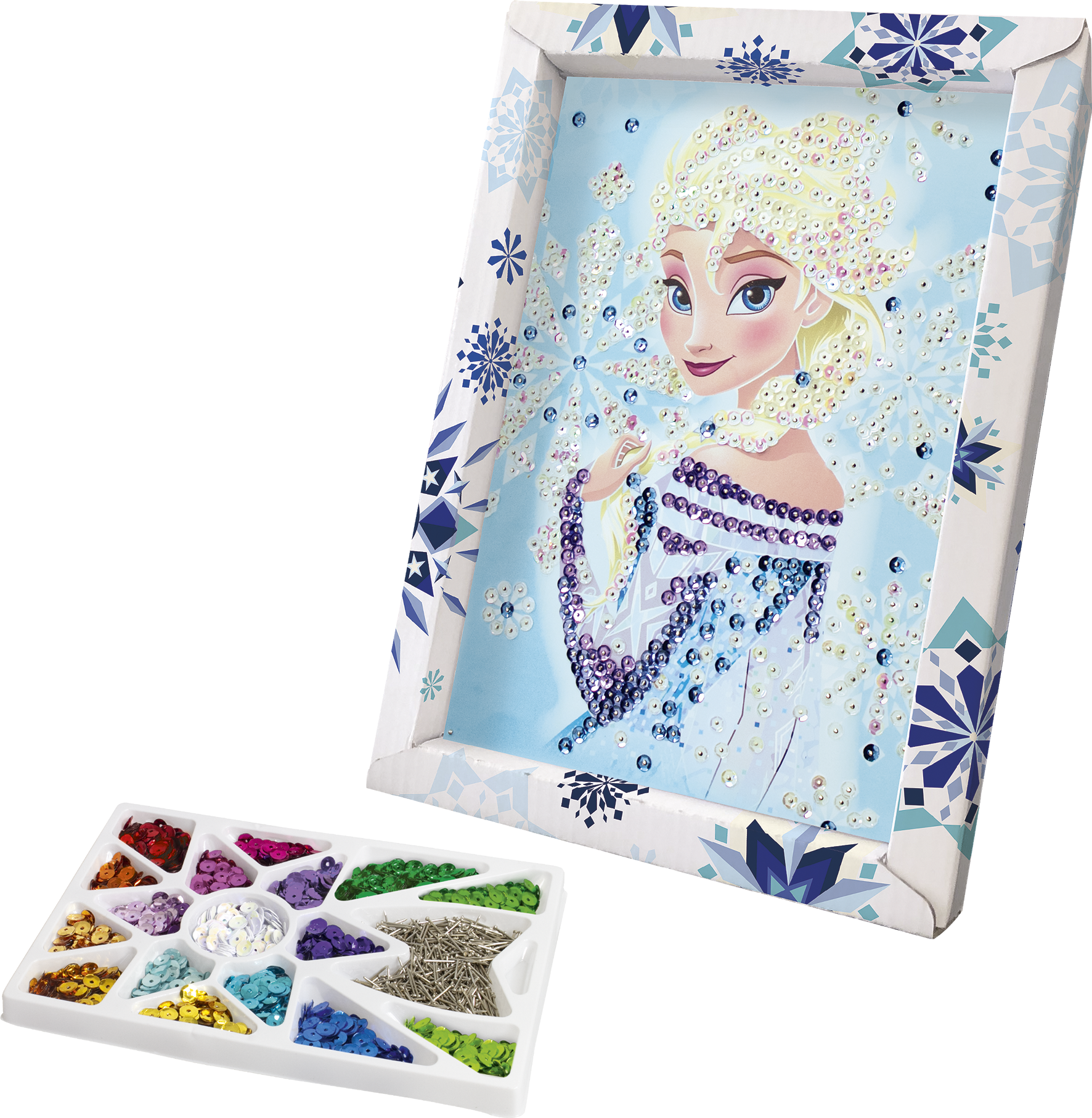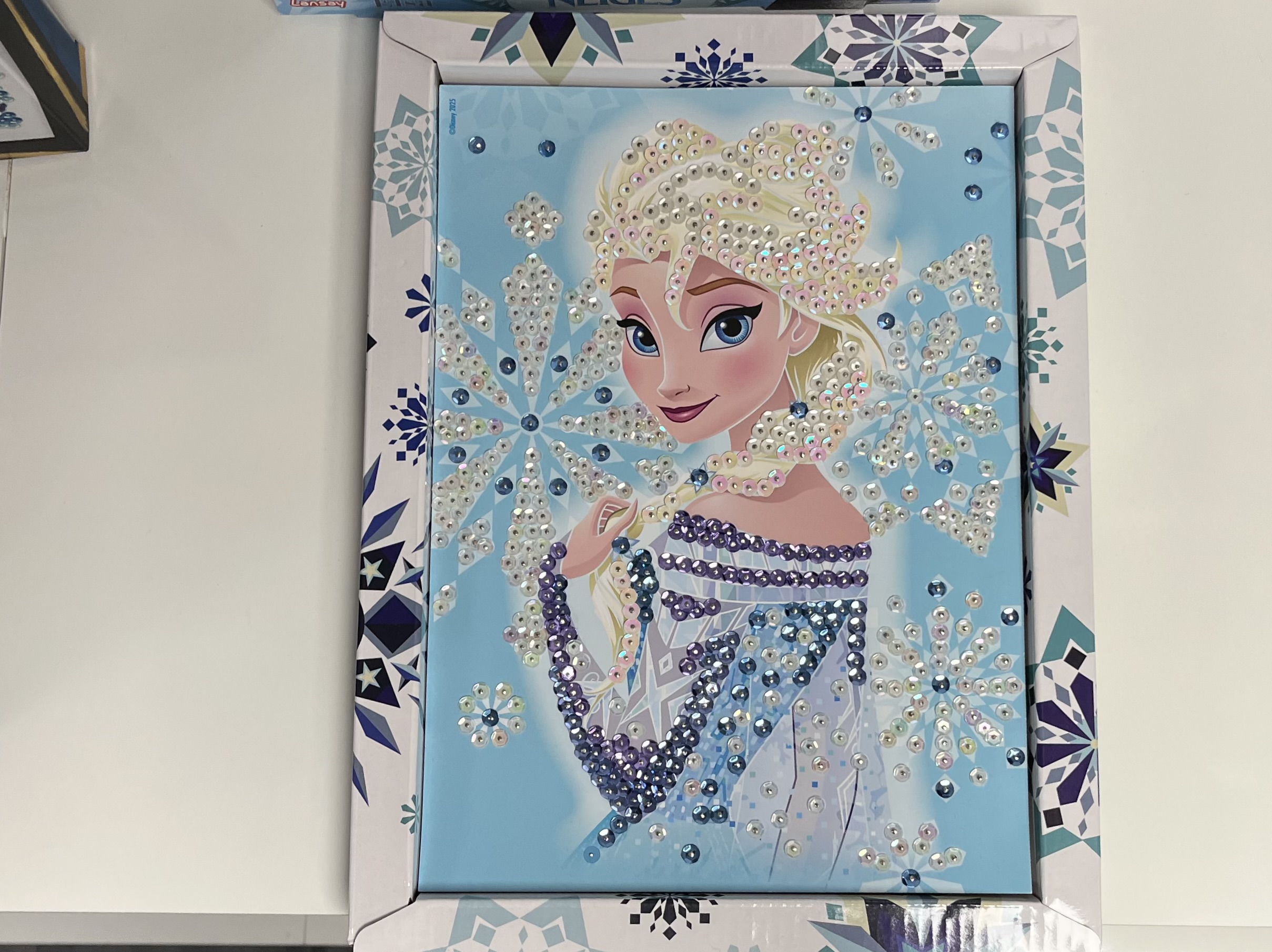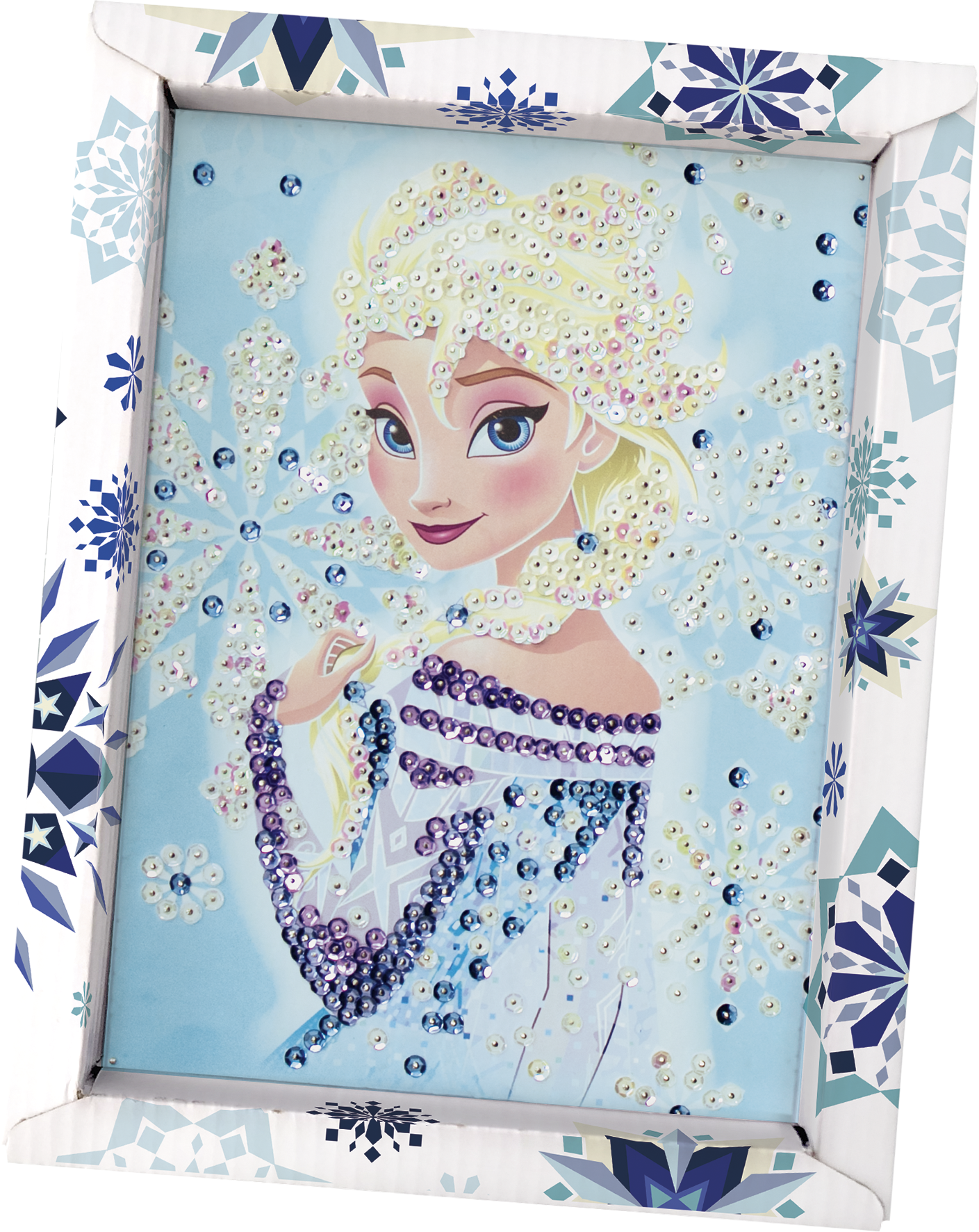 Dans ce kit, tu trouveras l'illustration de Elsa de la Reine de des Neiges dans son cadre, avec une plaque de polystyrène qui sert de base pour fixer les sequins à l'aide de petites épingles.