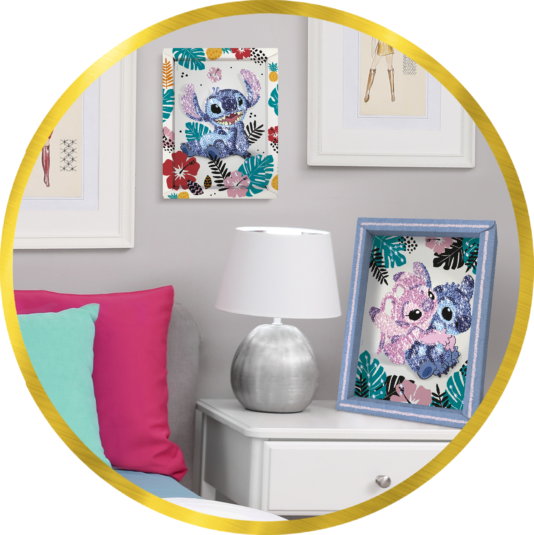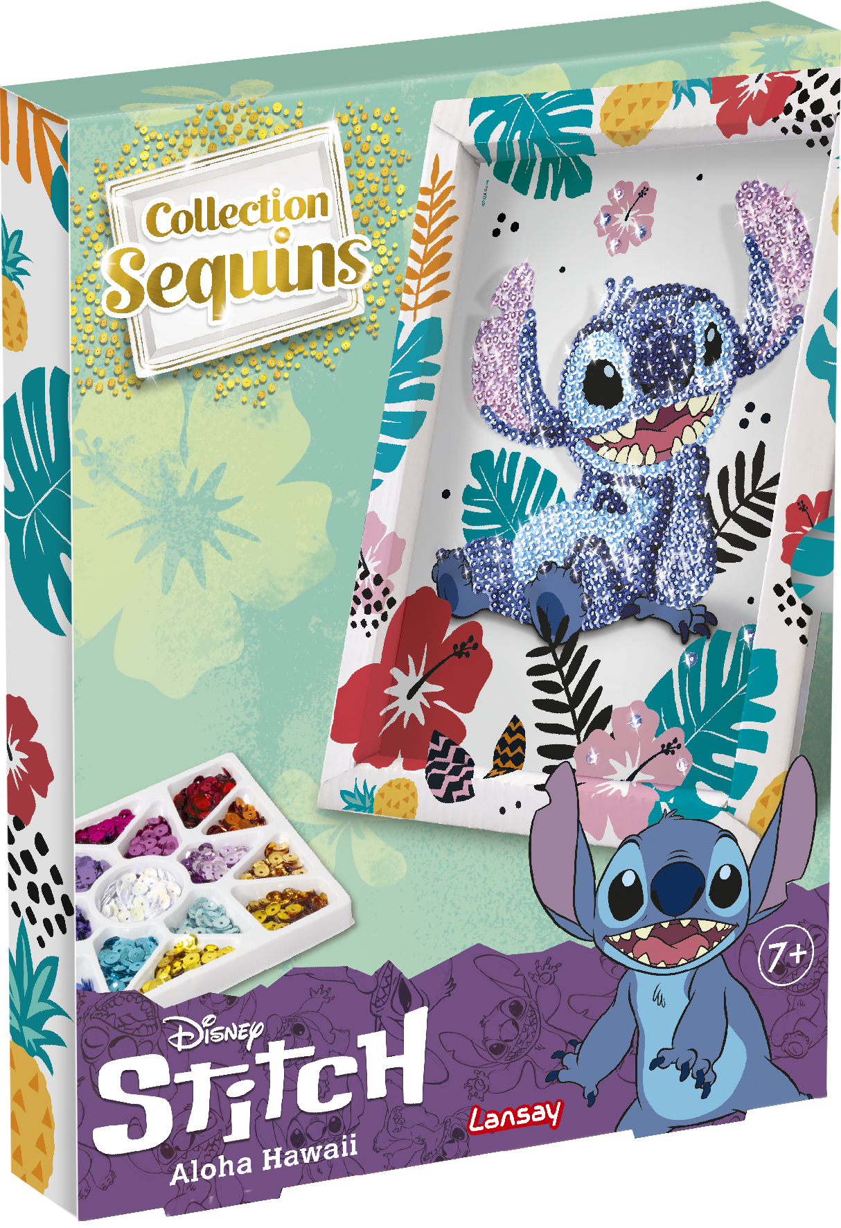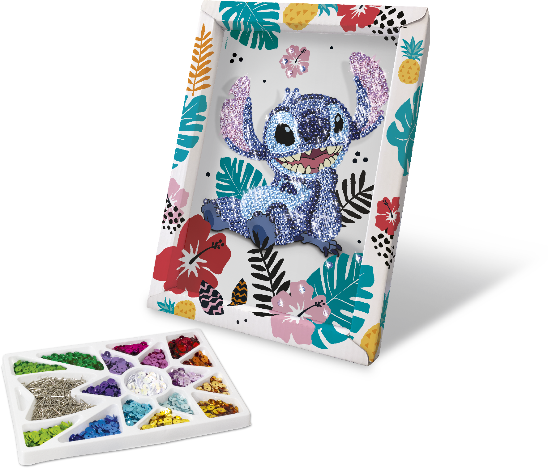 Dans ce kit, tu trouveras l’illustration de Stitch Aloha Hawaii dans son cadre, avec une plaque de polystyrène qui sert de base pour fixer les sequins à l’aide de petites épingles.