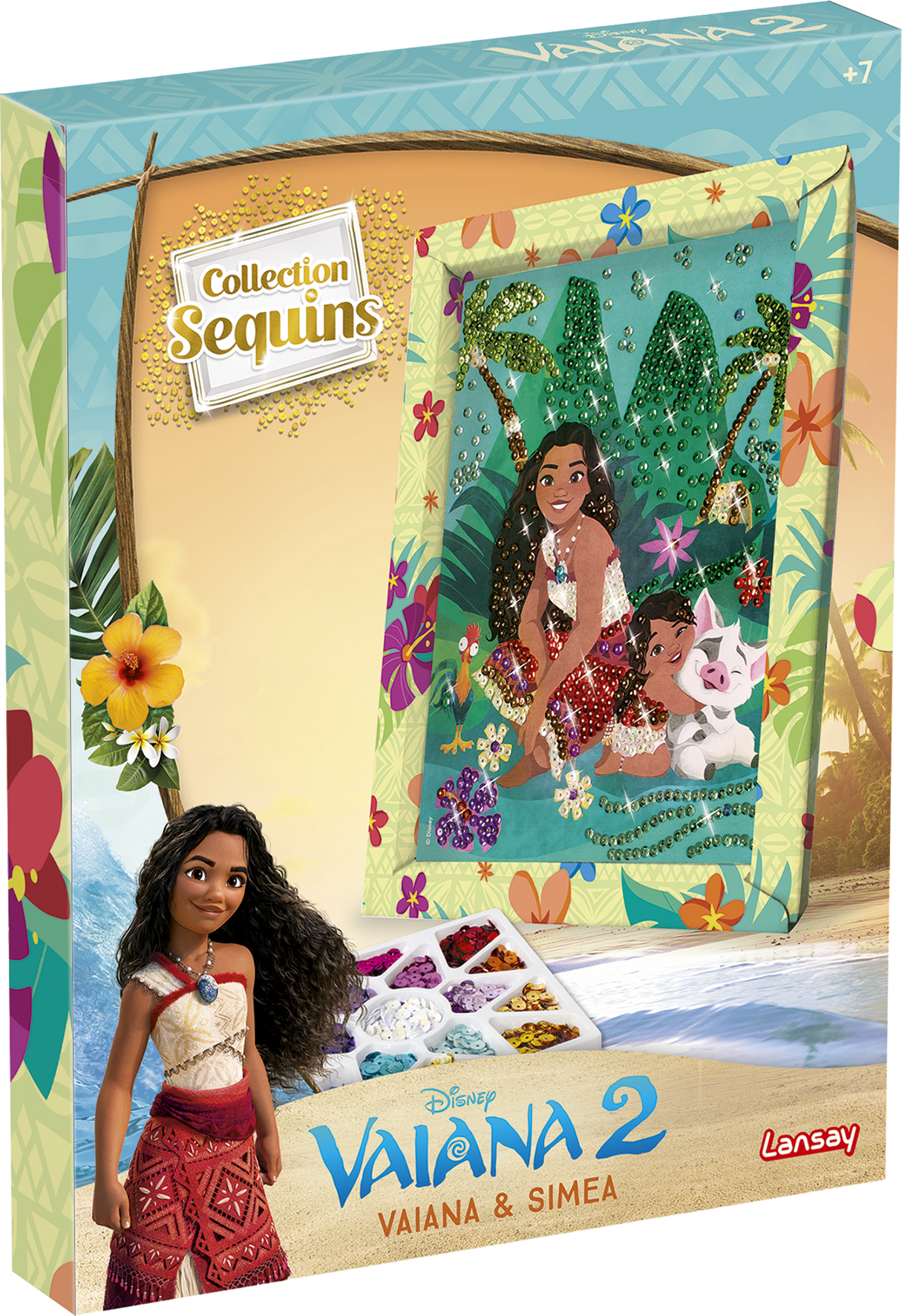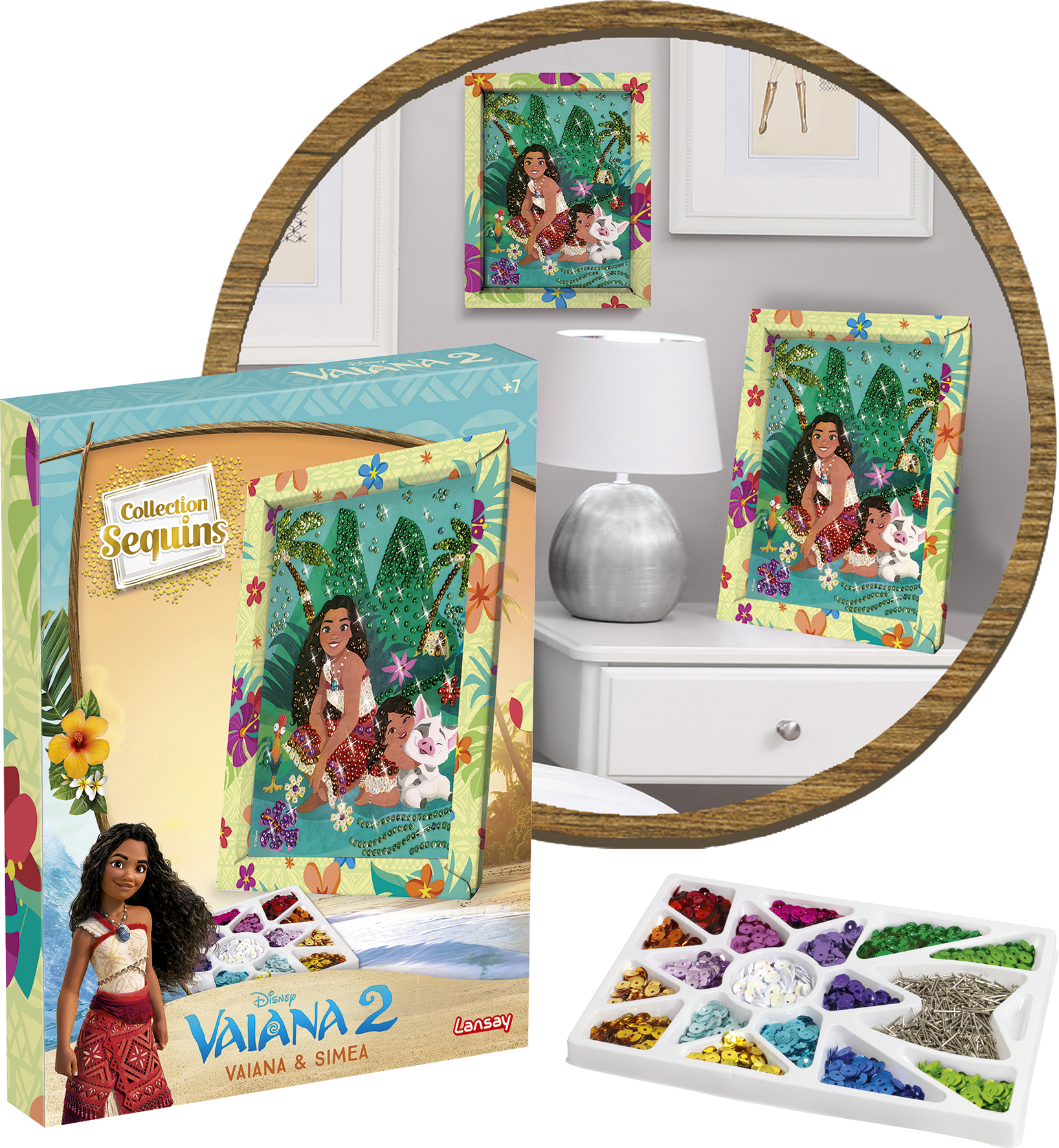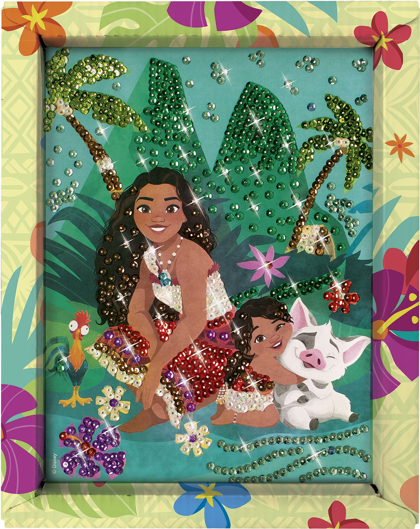 Dans ce kit, tu trouveras l’illustration de Vaiana 2 dans son cadre, avec une plaque de polystyrène qui sert de base pour fixer les sequins à l’aide de petites épingles.