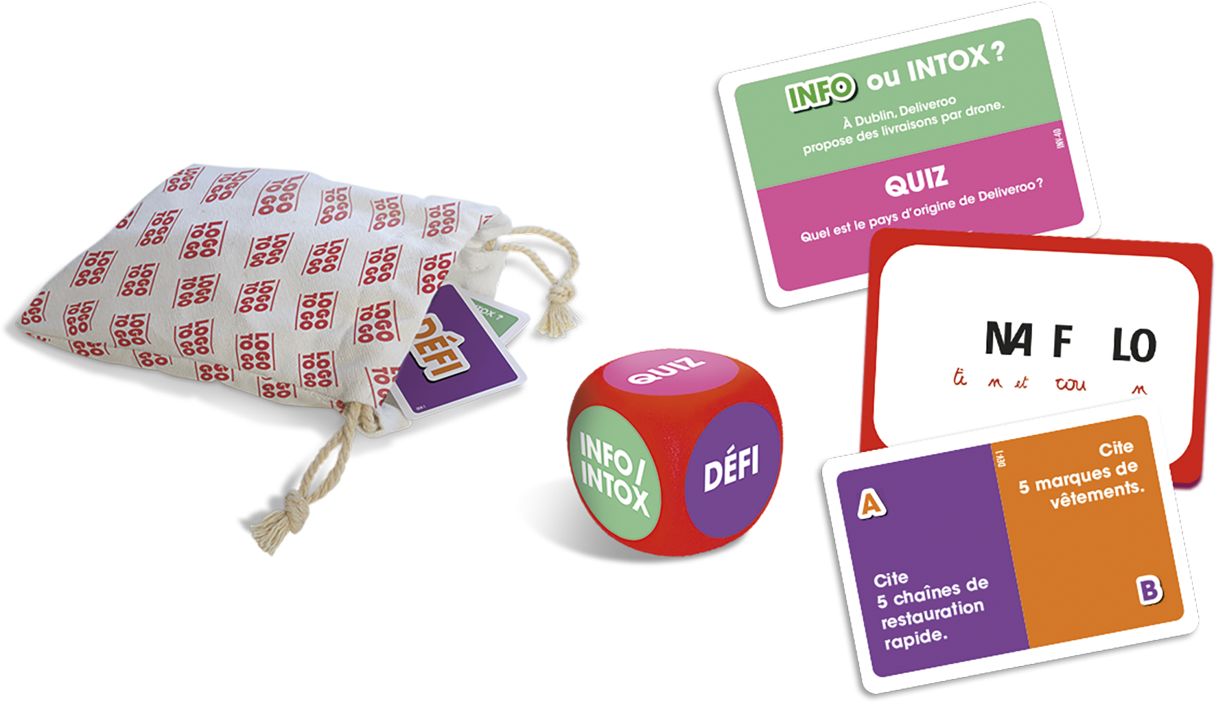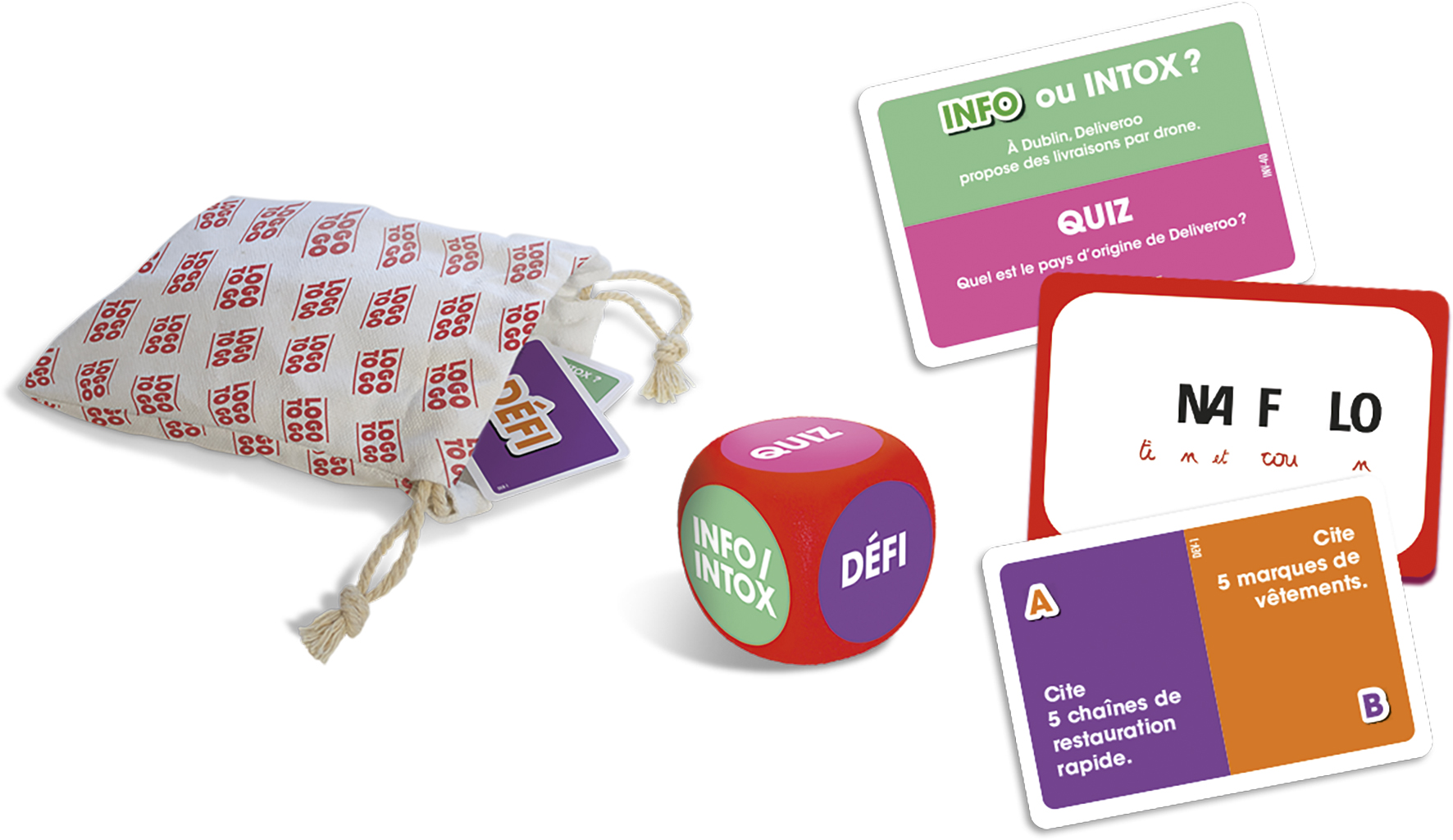 LOGO TO GO est un jeu d'ambiance reposant sur l’identification de logos modifiés et la réalisation de défis !